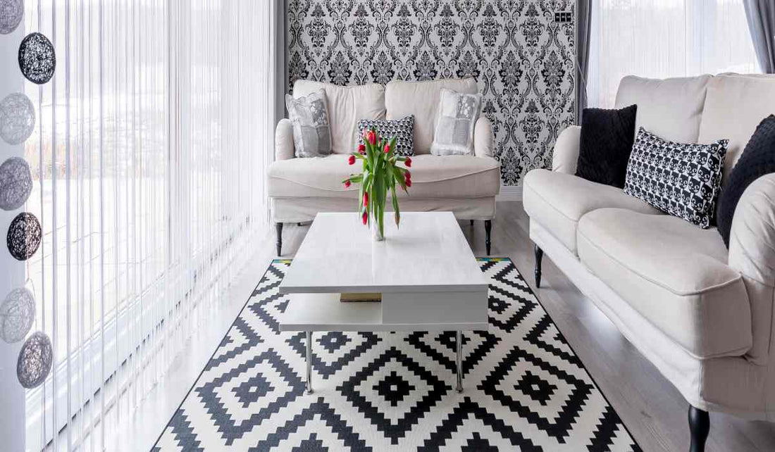 Simplistic furniture bang best with a large-patterned rug with black and white textures. Popping up a futuristic rug in your living room will enhance your furniture’s overall scenery.