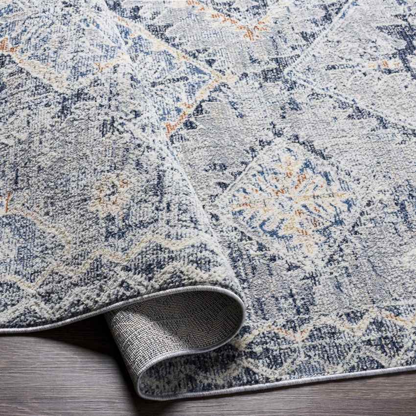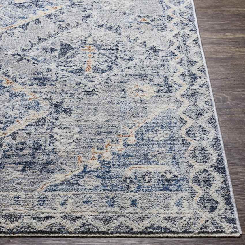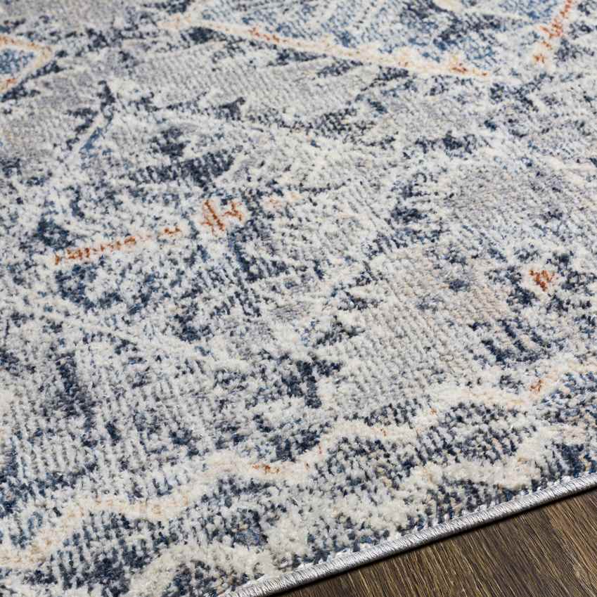 Discover the Allen Traditional Navy Area Rug, where timeless sophistication meets everyday resilience. This exquisite area rug features a deep and rich color palette, showcasing shades of navy, denim, gray, rust, light beige, and cream. It's the perfect embodiment of traditional charm fused with modern functionality, ideal for enhancing any space in your home.
