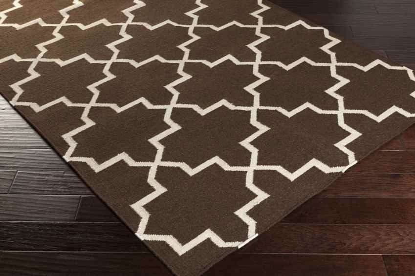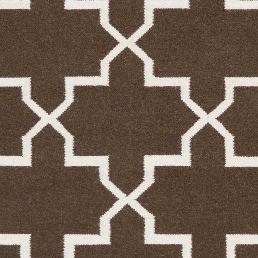The Aventura Modern Brown Area Rug effortlessly combines traditional geometric motifs with a contemporary twist. Hand woven in India from 100% wool, this rug features a sophisticated dark brown and ivory color scheme that adds warmth and elegance to any room. Its sleek, no-pile construction ensures a flat, smooth surface, making it ideal for high-traffic areas such as living rooms, hallways, or entryways.