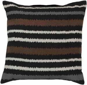The design of the Brussels Black Pillow Cover embodies a classic modern aesthetic through its strong horizontal stripes and carefully chosen color combination. The interplay of deep black and rich dark brown with the contrasting cream and subtle medium gray creates a visually appealing and versatile pattern. This straightforward yet impactful design allows the pillow cover to seamlessly integrate into various settings, providing a grounding element to bolder accents or enhancing the sophistication of a minimalist space. Its clean lines and balanced color distribution ensure an enduring presentation of modern form.