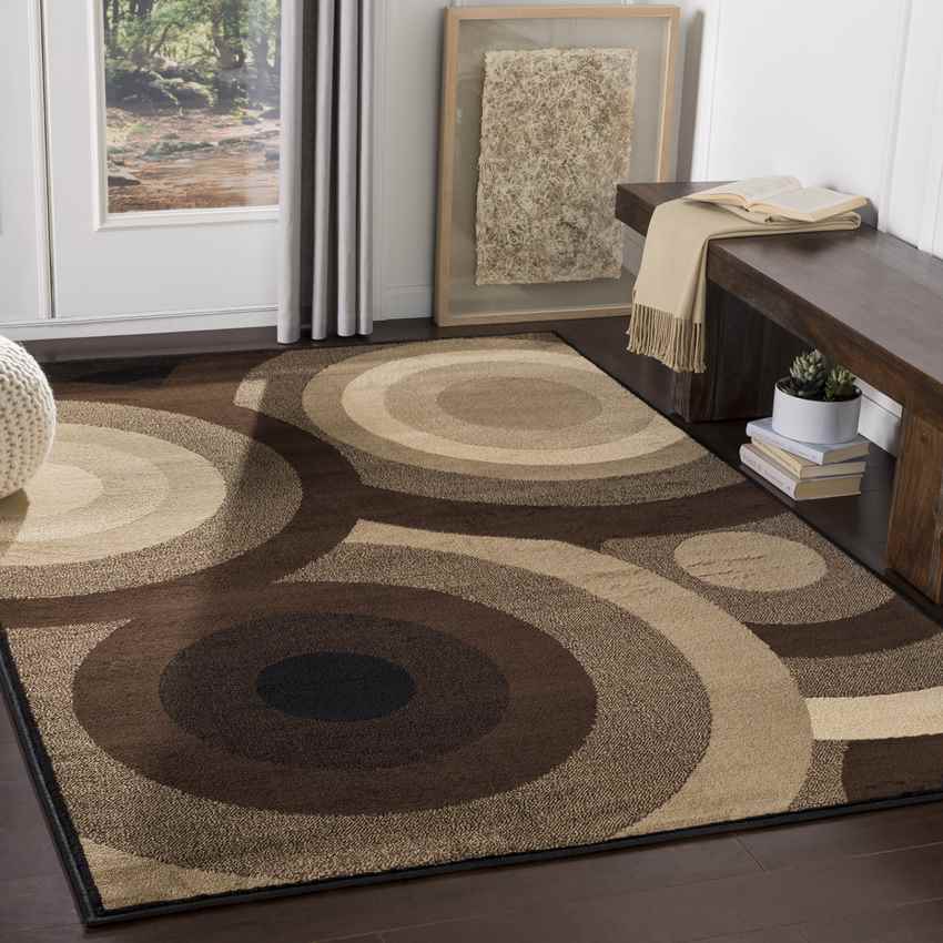 Be the trendsetter amongst your family and friends with the superbly stylish look on Gibsons Modern Dark Brown Area Rug displayed in your living room. This pattern with circular figures says modernism with a high voice and will surely make a fine statement in your home.