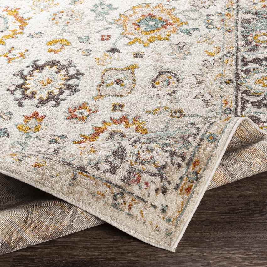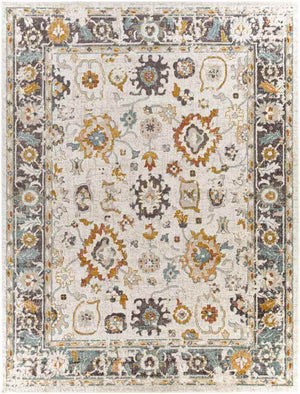 Transform your home with the Hoogwoud Traditional Ivory Area Rug, a beautifully crafted piece that blends timeless design with modern functionality. Featuring an intricate allover floral and geometric pattern, this rug comes to life with a balanced palette of rust, sky blue, mustard, off-white, light gray, and charcoal. Machine-woven in Turkey with durable polypropylene, it offers a medium pile height of 0.31 inches, making it a soft yet practical addition to high-traffic spaces. Perfect for family homes, this stain-resistant rug is both kid- and pet-friendly.