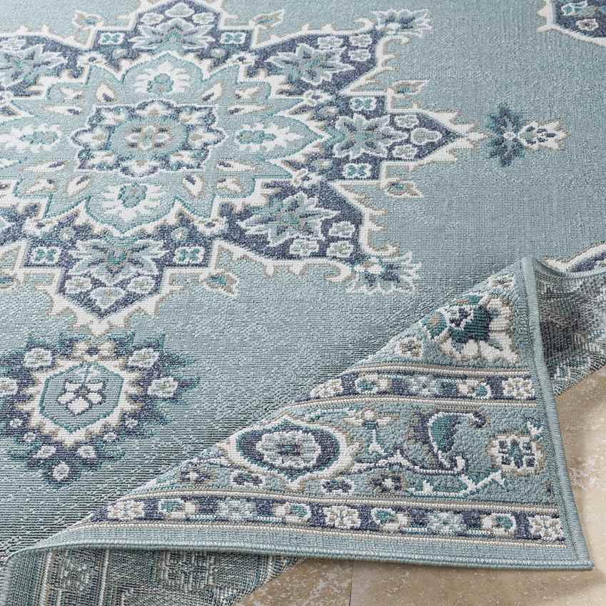 Lyla Traditional Aqua Area Rug is an elegant homage to classic pieces of Ancient Egypt. Traditional yet timeless, its vibrant palette accompanied by the calming presence of neutral colors remarks sophistication and solemnity. Its oriental pattern brings in an elaborate feel to your home decor with a classic elegance. Machine woven in Egypt with 100% olefin, it is also a perfect choice for homes with kids and pets.Outdoor Safe