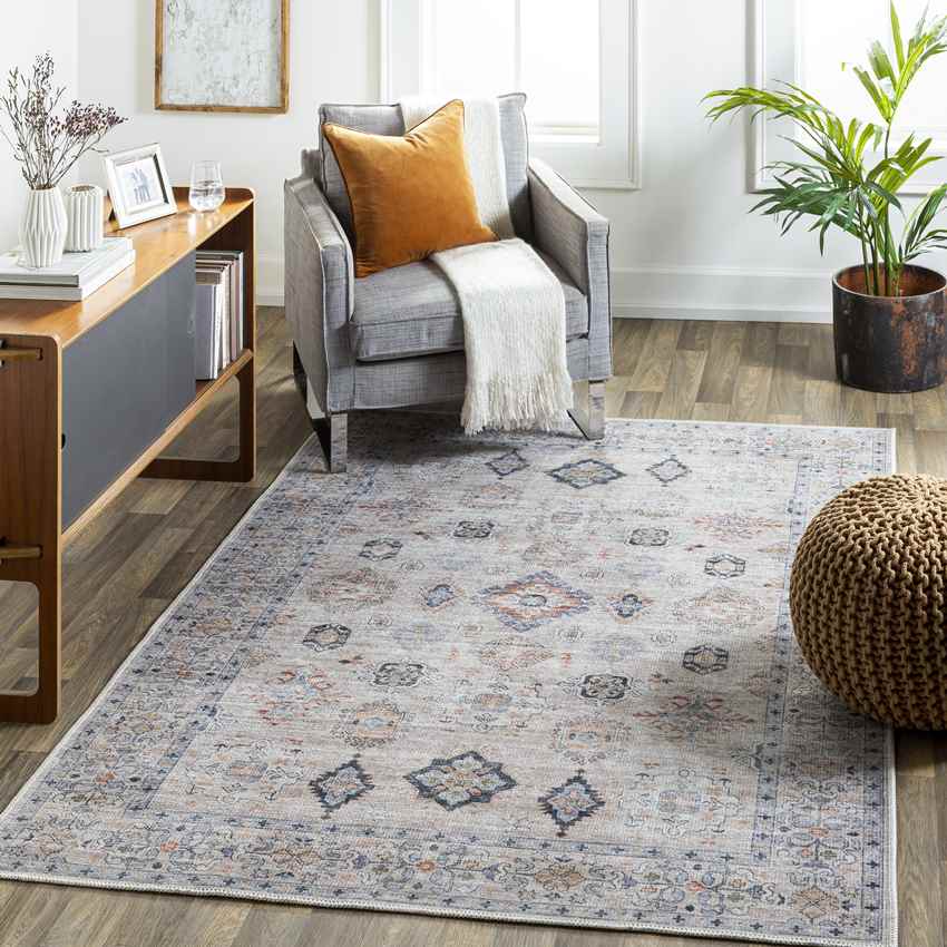 Inspiring and cool gray and blue shades on North Utica Traditional Beige Washable Area Rug are worth mentioning as they add a rustic yet modernized vibe to this element. With the warm harmony of gray and blues, this rug will look best with navy tone accessories or furniture. It is easy to clean and pet-friendly too.