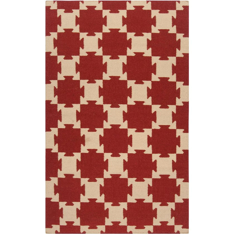 The Rhenoy Modern Dark Red Area Rug combines radiant colors with a tribal-inspired design to create a stunning statement piece for your living or dining room. Featuring a bold burgundy and light beige pattern, this hand-woven rug adds warmth and personality to any space. Made with 100% premium wool by skilled artisans in India, its no-pile construction ensures durability and a sleek, polished look. Whether you're looking to draw attention to a specific area or create a welcoming ambiance, this rug is the perfect addition to your decor.