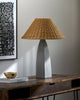 Illuminate your space with the timeless charm of the Rodger accent table lamp. Standing at 23 inches tall, this Arts & Crafts Traditional style piece beautifully combines a hand-painted concrete body with an elegant iron finial and a rattan shade that softly diffuses light. Perfect for adding a warm, inviting glow to any room, this lamp effortlessly merges organic textures and industrial elements for a uniquely captivating look. Easy to care for, simply wipe clean with a dry cloth to maintain its stunning finish. Elevate your dcor and let the Rodger table lamp become the standout feature in your home!