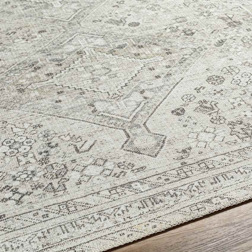 Discover the timeless beauty and practicality of the Tonganoxie Traditional Cream Washable Area Rug. This rug, skillfully woven in Turkey, combines a soft and resilient blend of 50% chenille-polyester and 50% polyester, ensuring it stands up to the demands of a busy household. The elegant cream base is accented with shades of off-white, sage, taupe, medium gray, charcoal, and light brown, creating a neutral yet rich palette that complements any room's decor. With a low pile height of 0.04 inches, this rug is perfect for high-traffic areas, marrying style with durability.