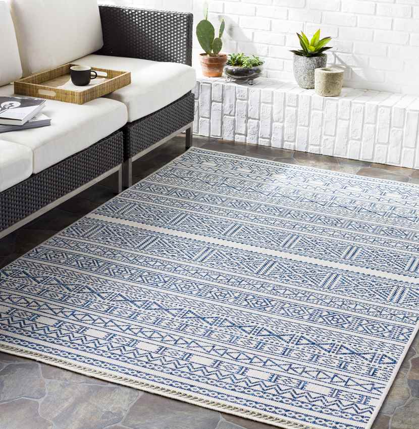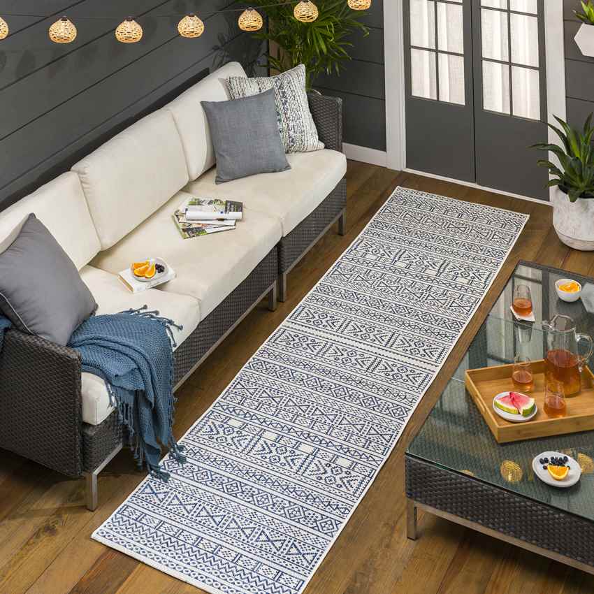 Single color and skillfully patterned Zoelen Global Navy Area Rug will change the atmosphere in your home in the most original way. This bohemian accessory is a delightful scene to add to your personal space.Outdoor Safe